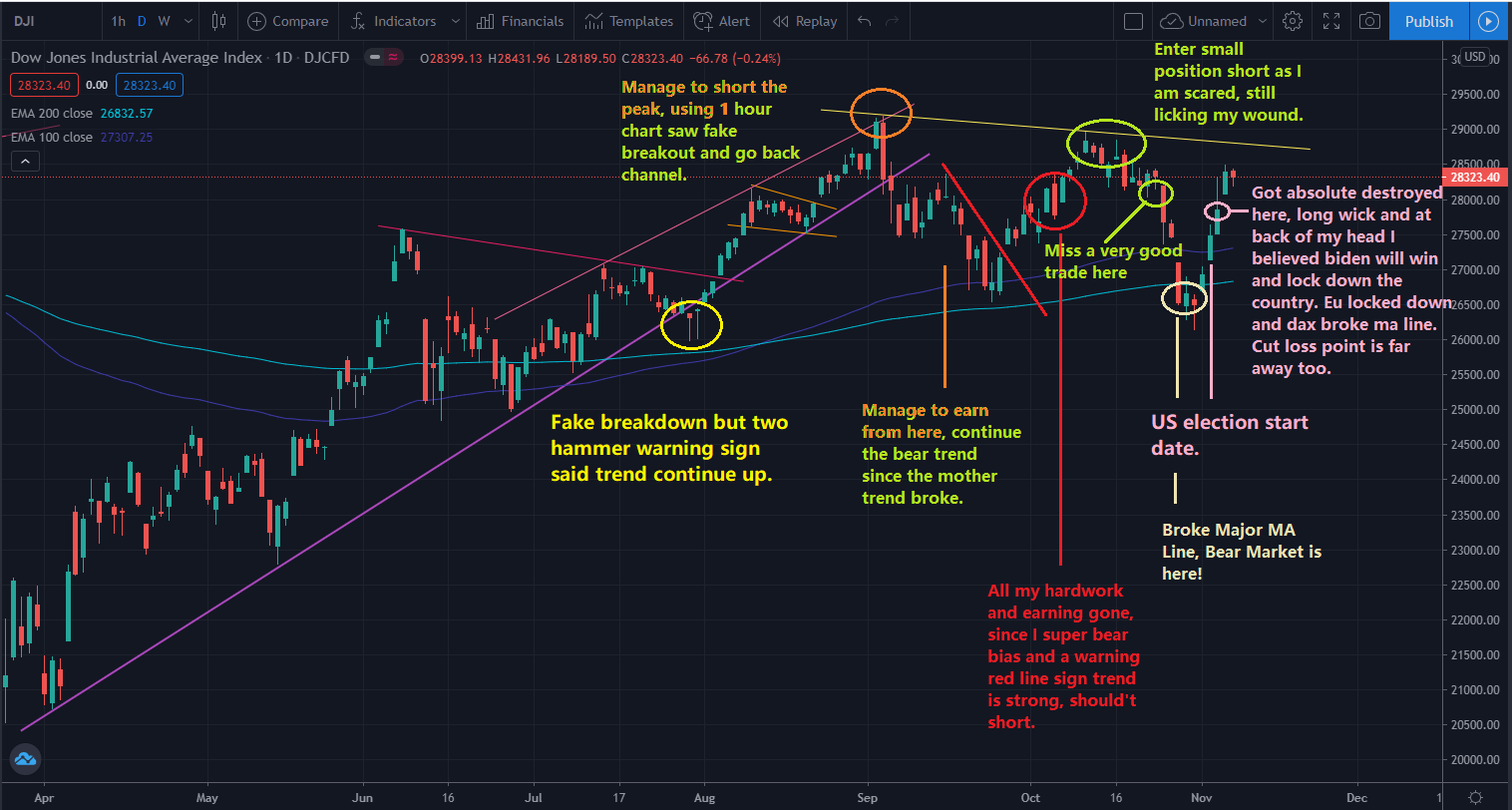 With a heavy heart I am writing this, this year is quite a disastrous year for me. It was the first time where US market is doing so well and all time high and on the other hand Singapore STI is really weak. I fear to invest because I am thinking what if Dow crash and STI will surely follow. I got caught with my pant when 2020 Feb crash, the market facing liquidity crunch and my BTC position got cut. The only thing I get it right was silver investment. Silver I intend to just HODL and even hit a low price of 11.80. I’m too heavy emphasize on the US election day thinking Biden will win and lock down the country. Special event day is really risky to trade. Stop loss should be tight. I miss out so much opportunities, example bitcoin, BYD, SATS, ThaiBeverage and other undervalue stocks.