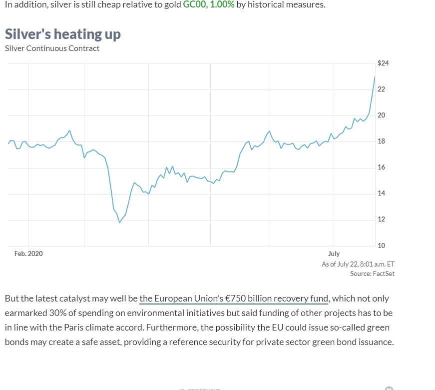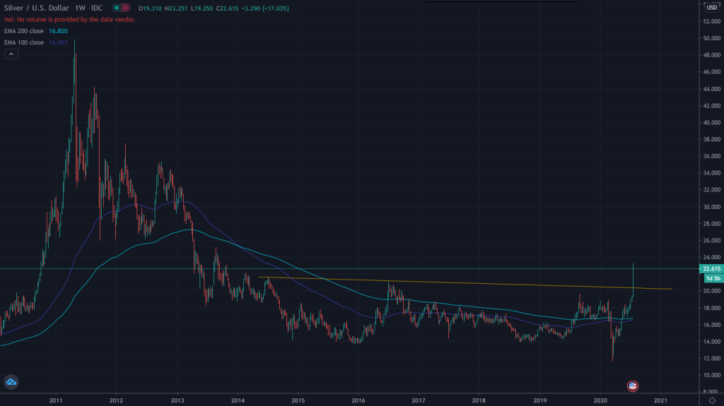 Broke weekly time frame. First target of 23 dollars hit. A big V killing of longist and panic seller then turn up. Future is very bright for silver, the trend is up with inflation and electrical car!
