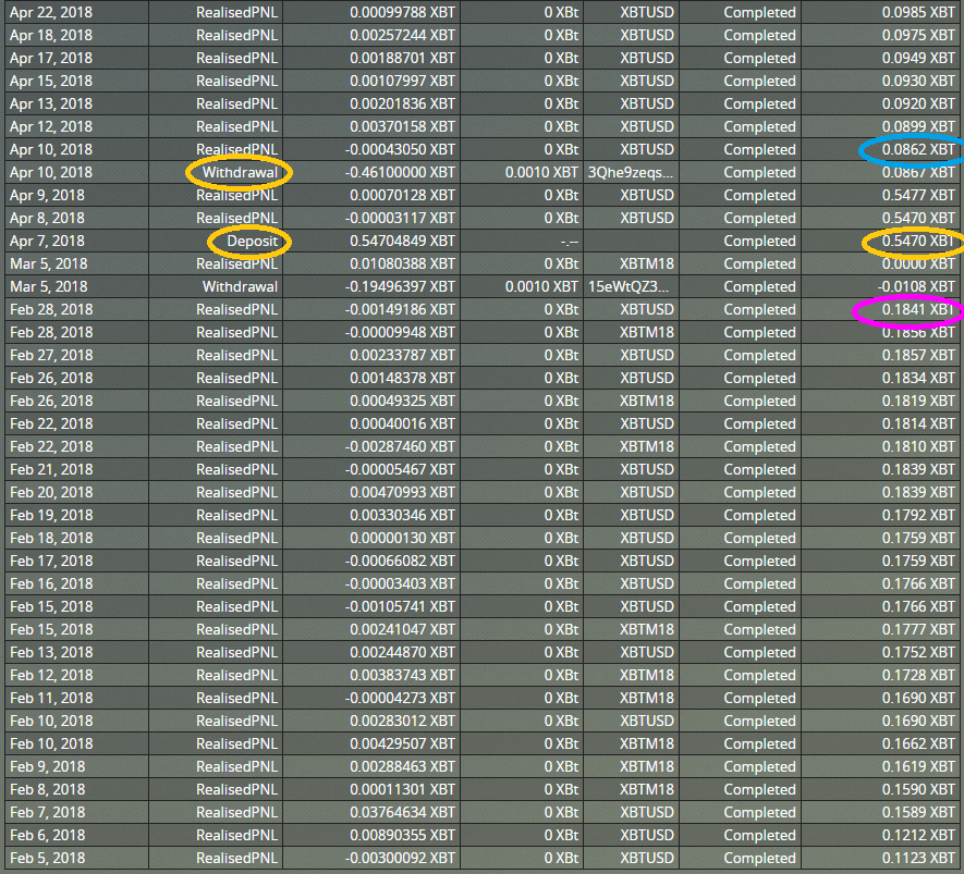 My first Deposit of 0.1 Btc.Did a 80% return within one month. Yellow circle is thinking of going bigger but bitcoin is too volatile so i back out and withdraw. Blue Circle Starting from 0.0862 btc. First Major Losses, 0.1591 down to almost 30%. I have short position and got trigger. Then the real big dump came later to 3000+ level. I remembered well.Get back on my feet and gain to 0.1523 and make a withdrawal. Left with 0.1 to climb up again. Slowly and steady.